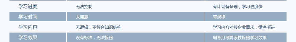 ● 因为面临的问题非常多,基本不可能实现自学成功。参见自学与参加达内培训班的对比图。