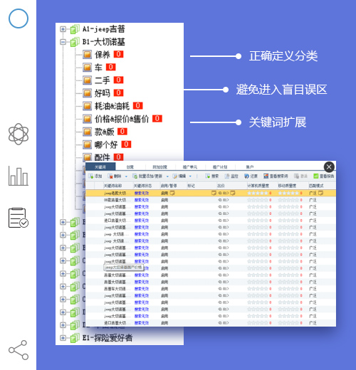 收集、总结、分析产品,确定合理的投放政策,分析、评估、优化网站投放的关键词,整合相近的关键词,进行整体的创意撰写,合理分配预算,效果最大化。