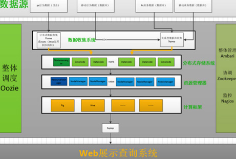项目涉及:Pig日志清洗,Hive离线分析,Sqoop关系型数据库和HDFS数据传输,ZooKeeper整体集群协调,Ooziezhengti diaodu。