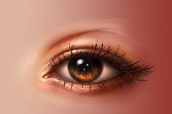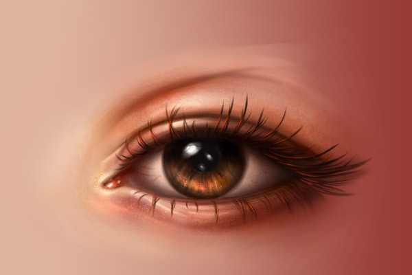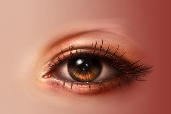 现在需要增加深度阴影。创建一个新的图层,拖放到“皮肤”图层下面。将图层设置为正片叠底模式,将填充降为80%左右,命名为“阴影”。将前景色设置为#3e1408,然后使用硬圆笔刷,只打开不透明度抖动,在眼白的边缘涂刷。然后调整笔刷到2像素大小,在高光点上画出睫毛在瞳孔上方的倒影。