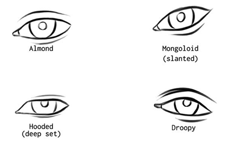 仔细观察不同人的照片,你肯定会发现差异。下面列举一些基础形状:从左到右从上到下依次是杏仁眼形、蒙古眼形(在其他国家的人眼中,中国人的眼睛普遍认为是这种样子。)、凹眼形、下垂眼。