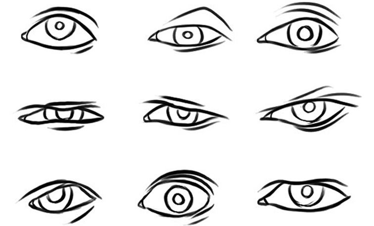 只要是人类的眼睛,就会流露下面这些表情。大家可以试着快速辨别这些都是什么情绪,并且尝试着画一遍。练习这些表情,这样画画的时候你能够赋予角色更多情绪。