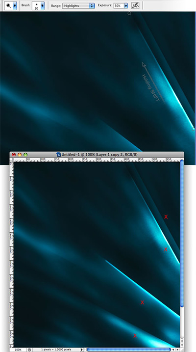11、现在选择颜色减淡工具(O)。这一次,让我们使用一个小的10px,曝光度使用30%。我们将加强光线的边缘高光。这样做,在光线边缘底部点一下,并按住Shift键在合适位置点一下,创建直线,可以重复操作。