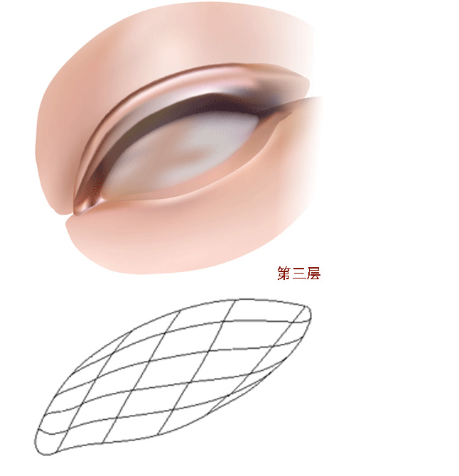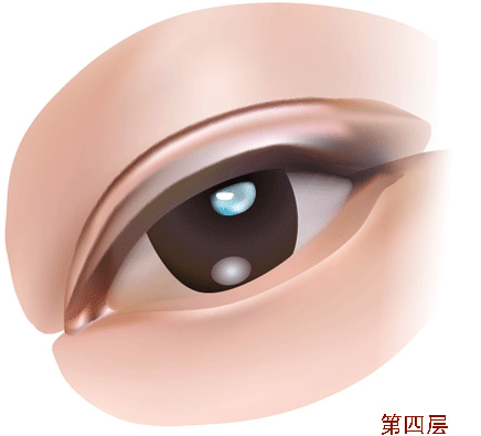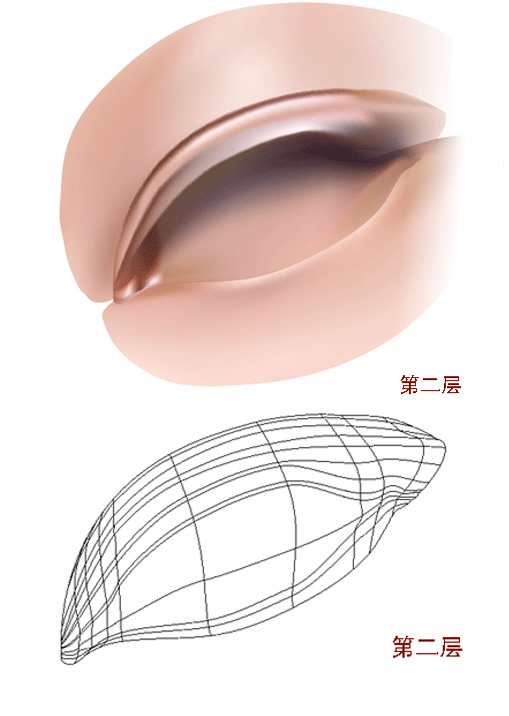 眼睛部分:先画出上下眼睑,边缘同样取脸部相同部位的颜色,脸部颜色变化多的地方可采 用渐变透明来过渡.