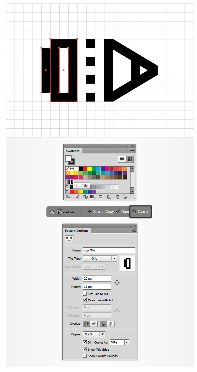 选中如下三个矩形,打开色板(窗口>色板),并按着鼠标将它们拖入色板中,存储为新的图案。在空白处点击一下,双击新的图案,重新命名为“starttile”(设置如下图所示),然后点击“取消”。