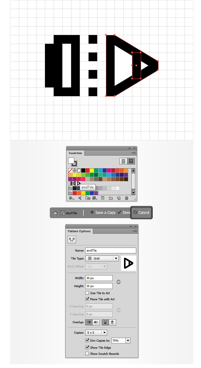 选择如下两个形状用同样的方式创建第二个图案(设置如下图所示)。双击新的图案,重命名为“endtile”。