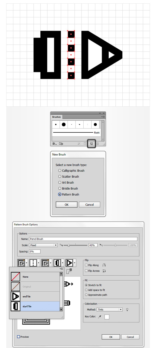 选择如下图7个矩形,打开画笔(窗口> 画笔),按着鼠标将矩形拖入画笔面板中,选择“新建画笔”,画笔类型为“图案画笔”。将它命名为 “Pencil Brush“,拖动滑块到40%, 着色方法为:色调,如下图所示创建新画笔。最后单击确定,你就可以在画笔面板里面找到你笔刷了。