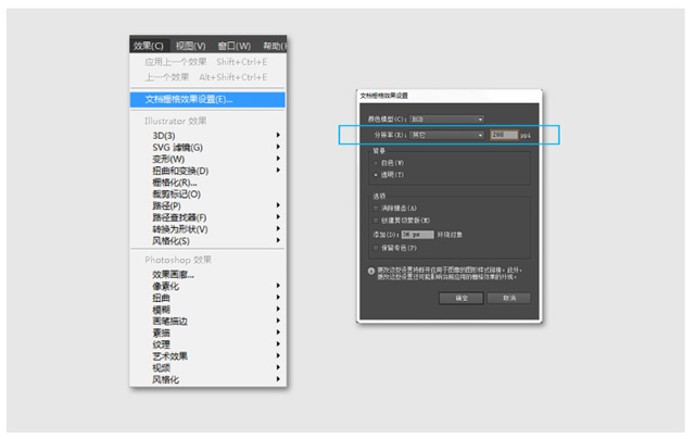 在开始绘制图形前,进入【效果> 文档栅格效果设置】,在设置面板中分辨率一栏选择“其他”,输入288。由于我们要运用到栅格化的效果,普通的矢量图遇到栅格化后会因为分辨率的问题让效果大打折扣,在此,我们将72ppi扩大4倍,这样输出的栅格效果就更加完美。