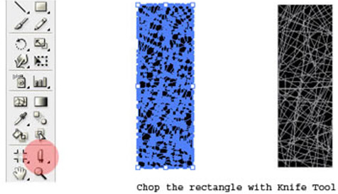 在工具面板中,选择小刀工具在矩形上切割,上下左右横着竖着随意的切割。 确保这个矩形上面没有遗留下大的部分。我们的目标是把这个矩形切割成很多细小的小形状。最后的结果看起来就像是下面的图像。