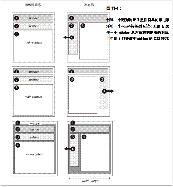 图11-4展示了3个两列的设计。左边的图表展示了网页HTML的源顺序:给banner的一个<div>,后面跟着sidebar的<div>,最后是main content的<div>。在右边,你可以看到实际的网页布局。在HTML中sidebar在main content前面,因此它可以浮动到左边(上图,下图)或者右边(中图)。