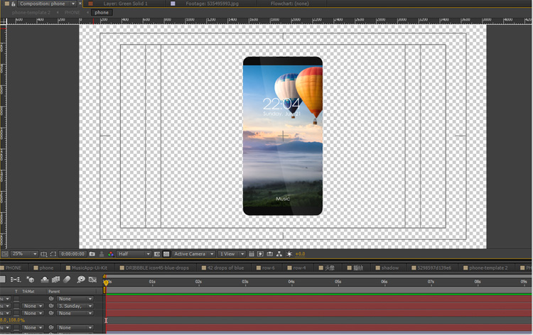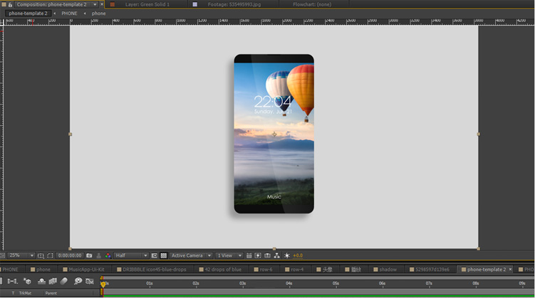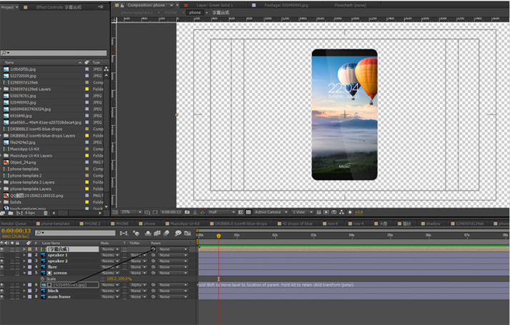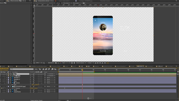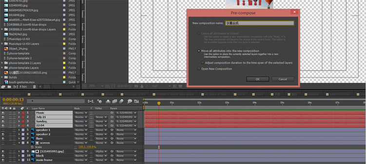 接着我们制作一个音乐界面,并且生成合成后绑定风景图层!过程跟字幕合成的绑定一样,只不过绑定的位置要设置好,在风景图层运动的最后一帧绑定!