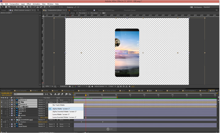 把字幕合成组和界面合成组都按照之前的风景图的方式对screen进行alpha matte的跟踪遮罩,由于只有一个screen,因此我们需要复制另外两个,然后分别放在界面合成和字幕合成的上面,然后再调节选项。
