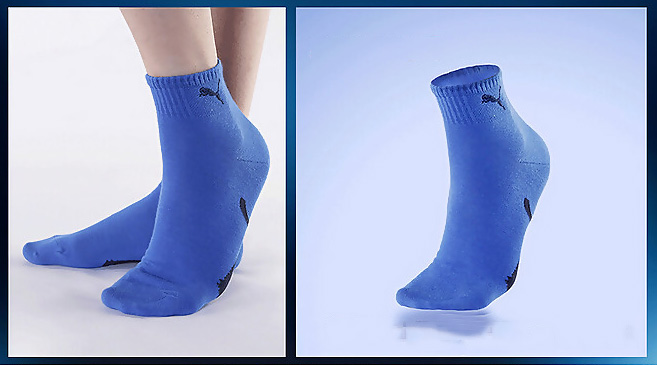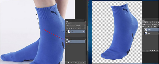 1.对穿在脚上的袜子,使用PS钢笔工具(快捷键P)进行路径抠图处理。或者使用快速选择,套索工具都可以抠图。