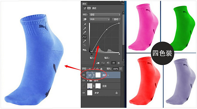 4.袜子整体较暗,使用调整层,对商品图进行调色。也可以使用色相饱和度,进行上色,调出不同颜色的袜子效果图。
