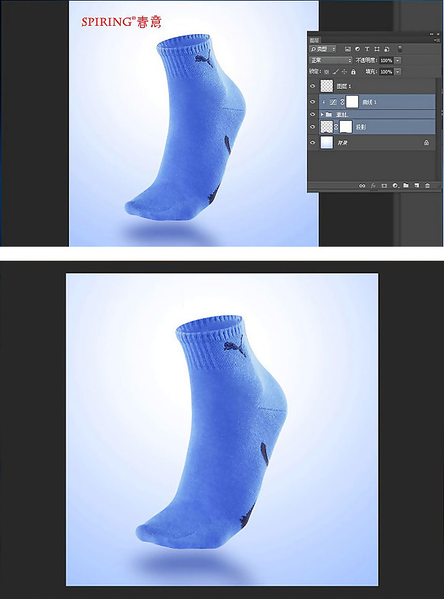 5.做一个渐变背景+袜子投影,加上商品标示。整个制作过程就是这样子。