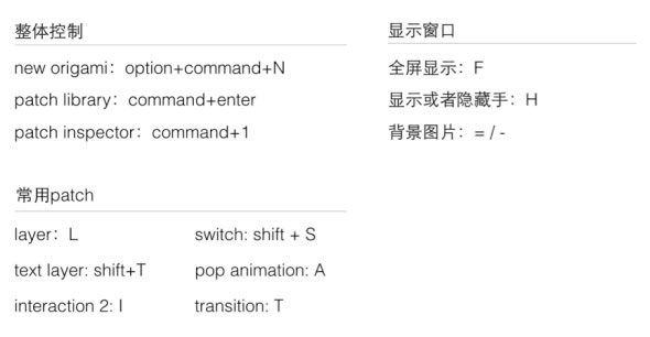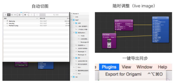 在Sketch里,只要把文件的名称命名规范,就可以用插件自动切图,再然后在Origami里面,所有图都可以用Live Image这个patch来承载,这样当你在Sketch调整图片的时候,使用快捷键“shift + option + command + o”,便可以一键同步到你的动态demo。