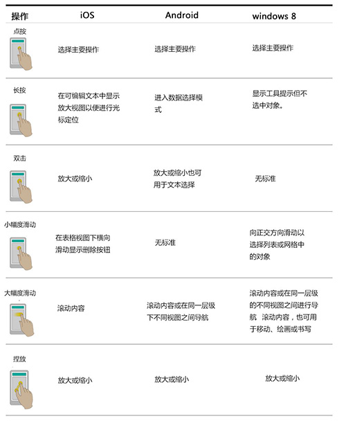 另外,关于触摸屏设备手势的开发也出现了一定的标准和模式。设计师可以,也应当根据自己所设计应用的情况拓展手势的疆界。
