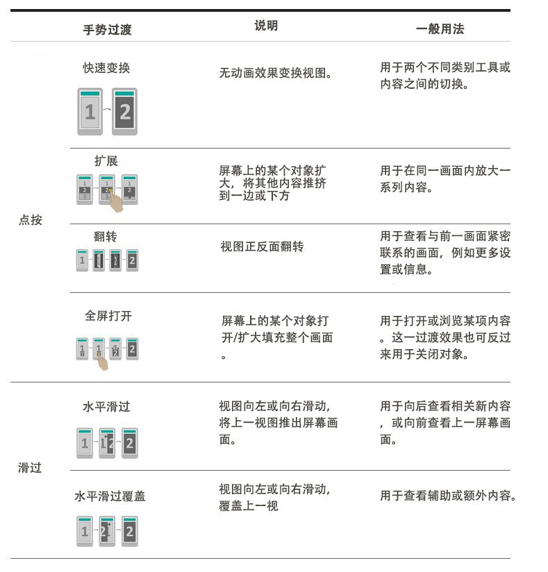 过渡是指让应用内不同状态之间界限变模糊的交互操作,其有助于故事的讲述或奠定手势的含义。在更多情况下,过渡可以帮助用户回忆过往内容,防止他们“迷路”。