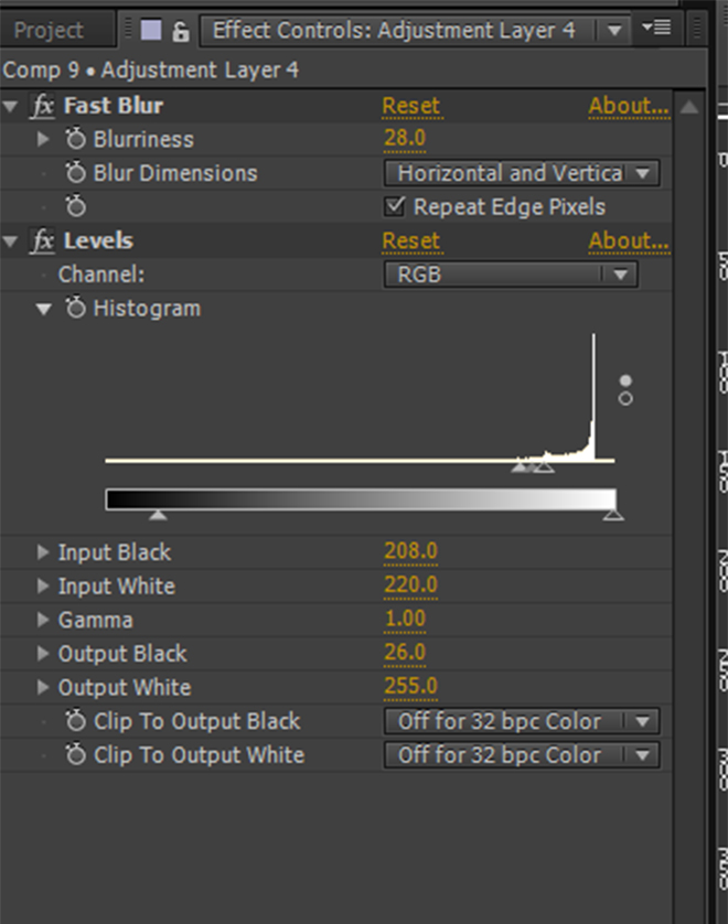 再对调节层加入levels特效(或者simple choker也可以),并且调节rgb的参数
