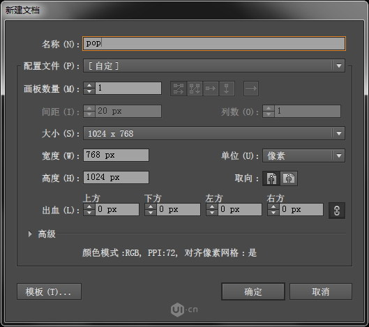 打开AI,新建文档。对于文档大小没有严格规定。如果是初学,可以试着和我的文档大小保持一致,参考下图,以便接下可以参考我将要设定的各种参数值。
