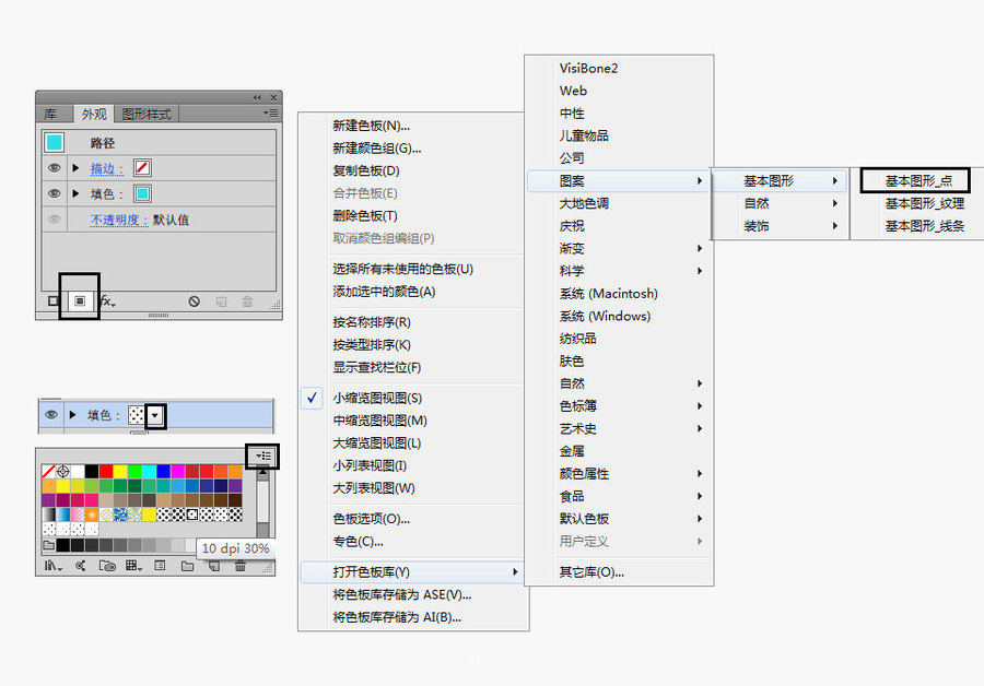 例如,我在此先为背景增加圆点图案。选中背景矩形,进入外观面板。在面板左下角点击增加新填色。然后在填色的方框中点击向下的小箭头,出现色板,如果你没有找到圆点图案,那么你需要点击右上角的图标,【打开色板库>图案>基本图形>基本图形点】,选择你认为适合的圆点图案。本例中,我选择的是10 dpi 30%的图案圆点,这和我设置的文档大小有关。