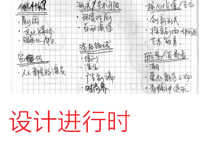 由于造动剧场的性质前无古人,无相关资料可查考,全凭客户对自己的品牌所作的详细描述和定位,客户甚至挥起笔来用自己的草图对品牌精神作了诠释。此举实在值得赞颂,一画抵千言。