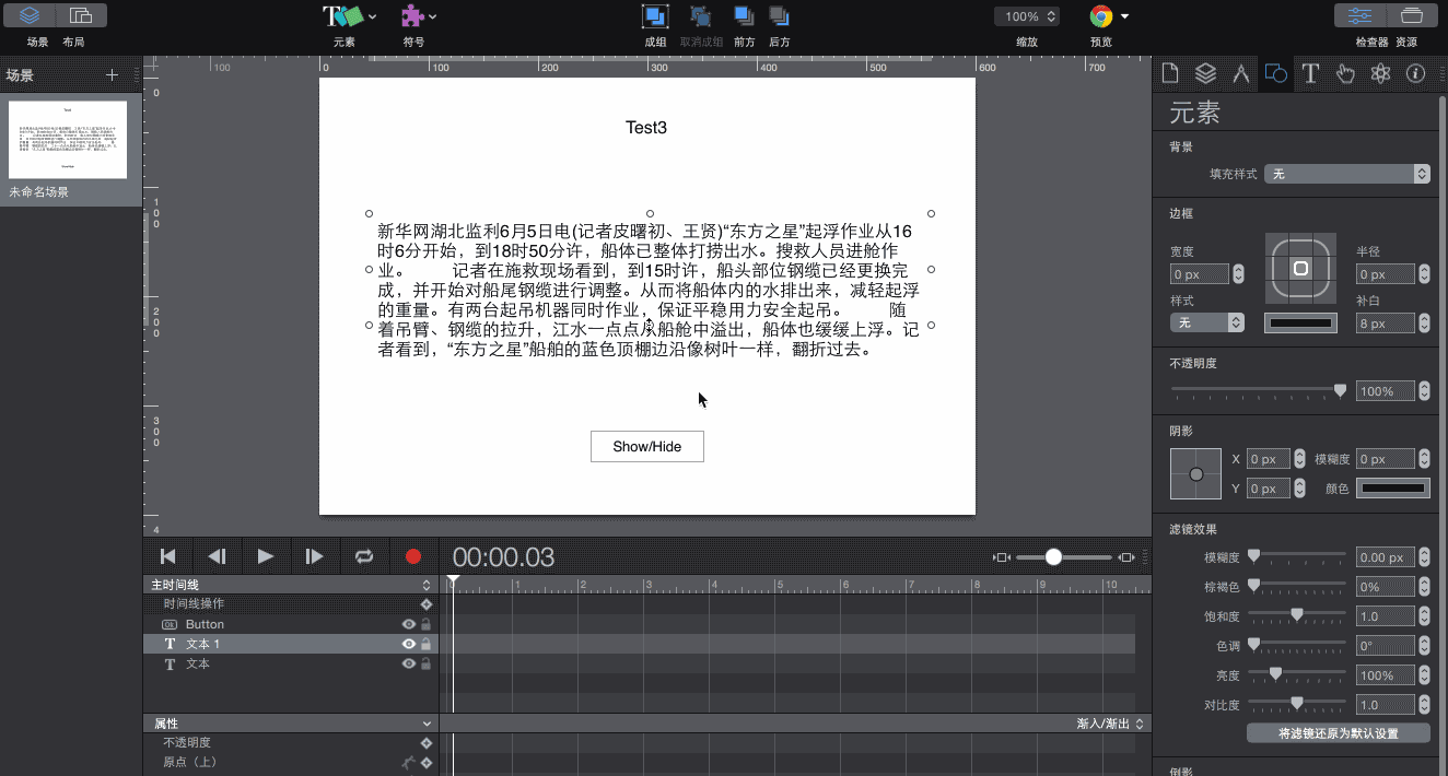 1.为了实现本部分的调用,这里我们先新建了一个文本和之前一样将他命名为Test3,作为我们的第三个测试实例名称。在场景中间插入一段我们要控制他隐藏显示的文本和一个控制该文本隐藏和显示的按钮。这里我随便找了一段关于“东方之星”报道的文字(为此次翻船遇难感到不幸)。