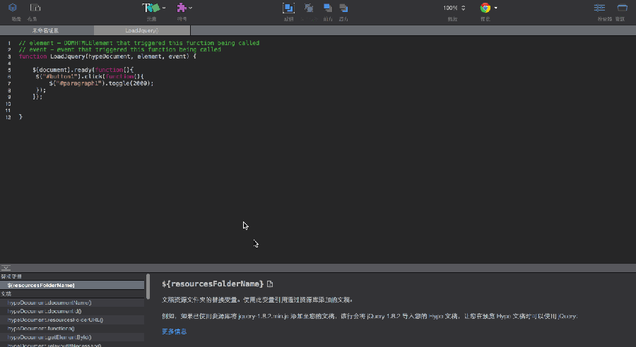 4.我们给这个函数命名为LoadjQuery,这里有个地方不一样,有人就要问了为什么和之前js的脚本代码调用不一样,不是简单输入函数名来执行,而是要导入整段jQuery脚本代码呢。因为jquery代码不能单独调用,需要有jQuery库的支持,这就是为什么我们前面需要下载jQuery库,并将其导入到Hype资源库中的原因。所以打开我们的代码文件,将Test3中的jQuery脚本代码复制粘贴到该函数中来运行。