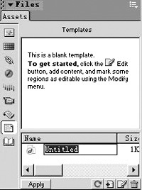 2、找到“Assert”子选项,在左边的工具栏中单击“Templates”按钮,此时的模板为空,我们可以在右下角单击“New Template”按钮,一个空白的模板就会出现在面板中(如图1),点击模板名称,是模板进入可编辑状态。注意,此时的模板还没有任何添加任何元素,我们可以像编辑普通网页一样在模板上添加表格、图像、文字等。添加完后,保存模板,可以在默认站点文件夹的“Templates”子文件夹下找到刚才做好的模板,扩展名为.dwt。