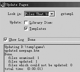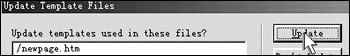 打开“Templates”子选项,双击关联网页的模板,这时候模板进入了可编辑状态,黄色区域消失,改变了模板的内容后,保存时就会出现一个提示对话框:“下列网页使用了当前模板,是否进行更新?”(如图2)单击“Update”,此时,网站中所有基于模板创建的关联网页都将得到更新(如图3)。