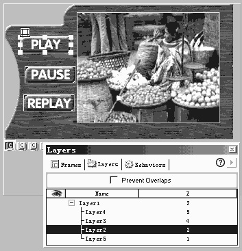 利用Photoshop制作一个金属效果的播放器外观。(具体效果就看你的喜好啦,也许你可从Winamp的skin中受点启发)。作最佳优化后,输出一个透明的GIF图片。为了让鼠标移上后按钮有些变化,你不得不每个按钮制作2张图片(共6个) ,两个按钮只需有颜色上的差异即可。先建三个层,调整好位置,并插入三个播放键的各自的二张翻滚图片(Rollover Image)(Insert-Rollover Image)。通过调节层的Index-Z的值,确保播放器所在的层在Layer_main层的上面,在按钮所在层的下面。排版好的各层如图所示。