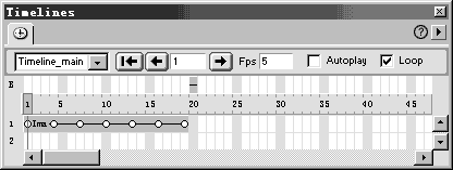 按Ctrl+F9键打开时间链浮动工具面板。选取其中幻灯片所在层(Layer_main)中的初始图片(确保选取的是图像,而不是层),用鼠标拖至时间链浮动工具面板,在时间链起始处释放鼠标。设定帧速率为Fps为5,并勾选Loop框。选择时间链中� ��其中一帧,右击鼠标,选择"Add Keyframe"(添加关键帧),选择另一幅幻灯片图片,以更换层(Layer_main)中的初始图片。重复这个操作,将剩下的5幅图片全部加到该时间链的不同关键帧上。最后适当调节各关键帧之间的距离。并将该时间链命名为TimeLine_main。建立好的时间链如图所示。