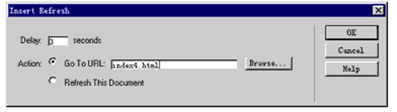 制作一个新的首页作为重定向的页面。用“ head ”对象面板的“ Insert Refresh ”定向到未使用 Flash 技术的网页,如图。它会在页面头部加上如下代码: < meta http-equiv="refresh" content="4;URL=noflash.htm">