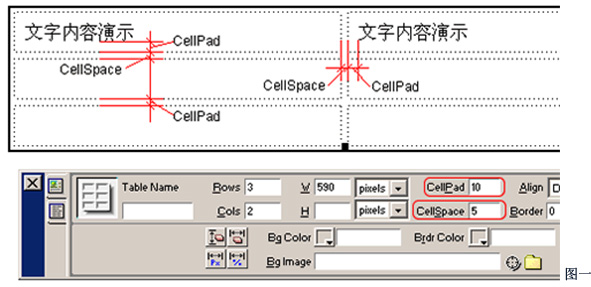 首先我们需要了解两个表格属性面板上的参数:CellPad和CellSpace。如图一所示,CellPad是指表格中两个单元格之间的距离,CellSpace是指每个单元格与它中间的内容之间的间隔距离。通过改变这两个参数,并配合背景色彩的变化,可以方便的做出1像素的表格边框。