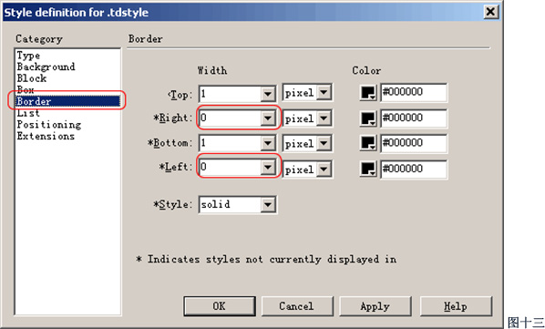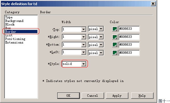 Width代表上下左右的边框宽度;Color可以分别定义上下左右边框的颜色;Style可以丁一边框的样式,常用的为solid(实线),其它类型还有:dotted(点线)、dashed(虚线)、double(双线)、groove(槽线)、ridge(脊线)、inset(内陷)、outset(外陷)。不过有几个类型必须是IE5.5以上版本才可以看到的。
