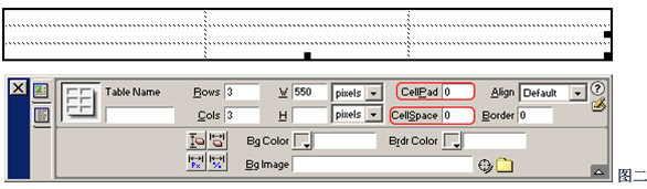 1、使用Object面板插入一个表格,定义表格宽、高及行数和列数。注意此时Dreamweaver中插入表格的默认CellPad和CellSpace、Border都为0。如图二;