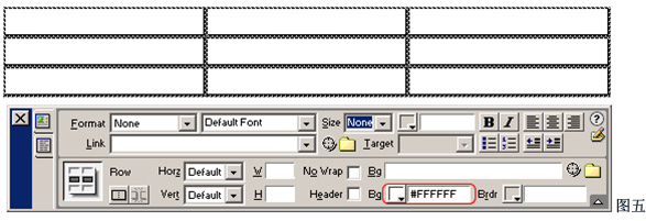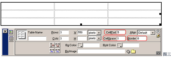 2、在属性面板中定义表格的Border为0,CellPad为5(这项可使单元格中的内容与单元格边缘之间保持5个像素);CellSpace为1(此项使得单元格之间保持1个项素的间距)。如图三;