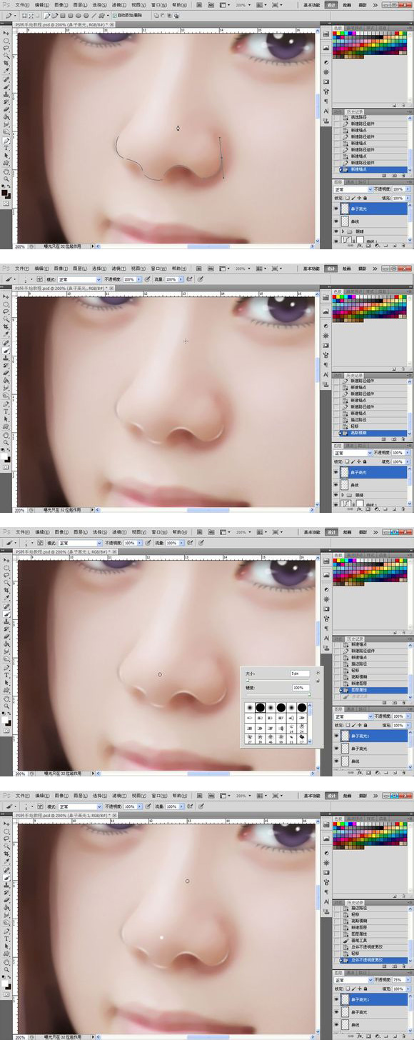 24、接下来我们做高光,勾出如图所示路径,用纯白色描边,高斯模糊一下,数值2左右,接着我们用画笔在鼻尖处点一个小点,为的是有一种水润的感觉,鼻子部分结束。
