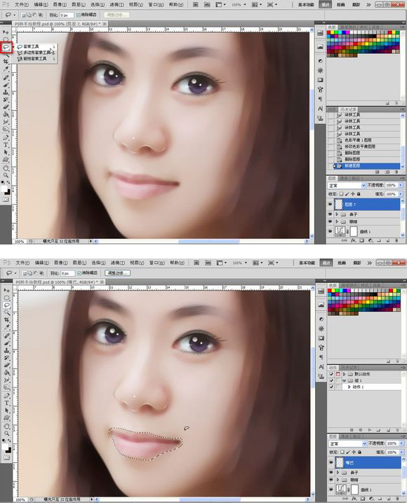 25、嘴巴部分:嘴巴部分也是很简单的,首先用套索工具把嘴的大概轮廓选出来,之后右键羽化10个像素。