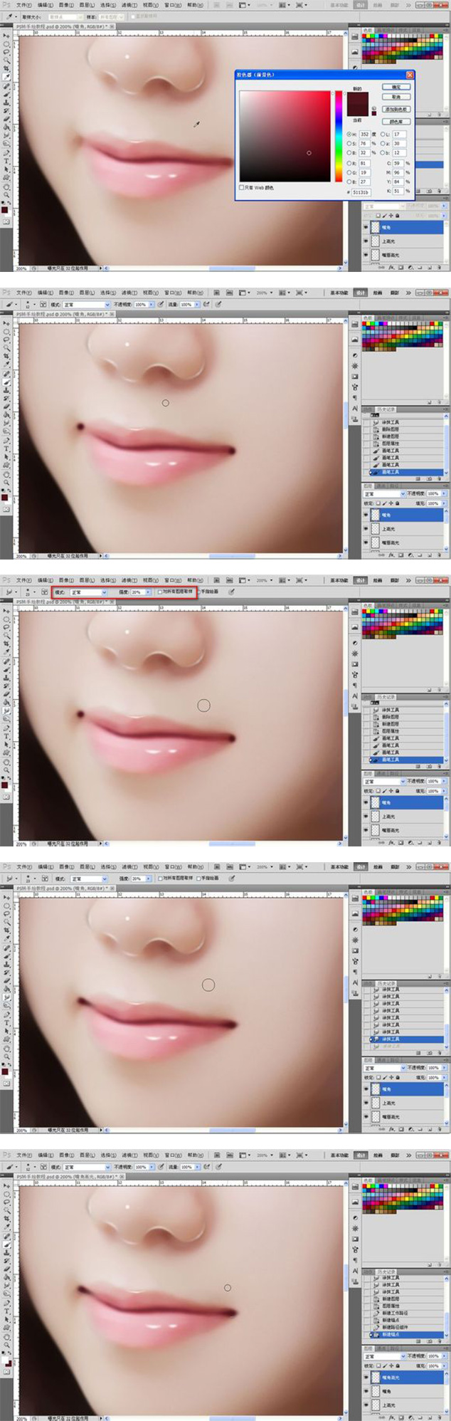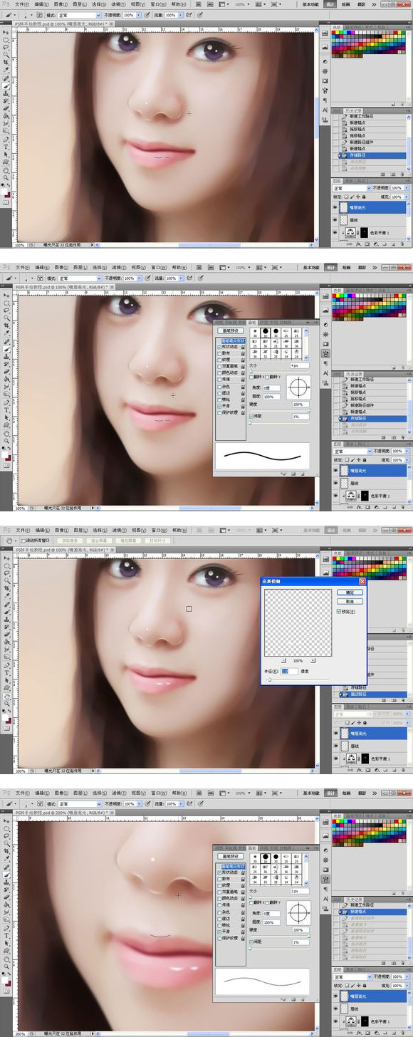29、接下来是嘴角,用比较深的皮肤颜色点两个小圆,用涂抹工具涂抹向反方向涂抹如图所示,在下面勾两条小路径做嘴角高光,2像素左右,好了五官的处理到此结束。