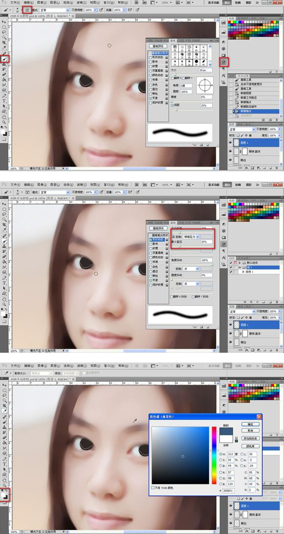 【形状动态】勾上,钢笔压力一般我都是20%,直径越小,出来的线段两头越尖,接着选择一个中性色,如图所示,色相无关系,后期可以变换,之后选择所有晶状体图层,按【ctrl+e】把图层合并成一个。