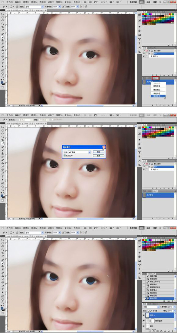 11、选择画笔工具,点击图层面板的路径,右键工作路径,路径双击可以储存。选择描边路径,勾选模拟压力,如图所示,效果如图所示。