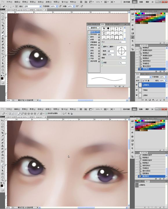 19、接下来是双眼皮,如图所示勾两条路径,如果眼睫毛挡住了可以先把眼睫毛的图层关闭,【滤镜】-【模糊】-【方框模糊】数值自定。我们来制作一个眼影的效果,这样双眼皮就不会很突兀,如图所示。