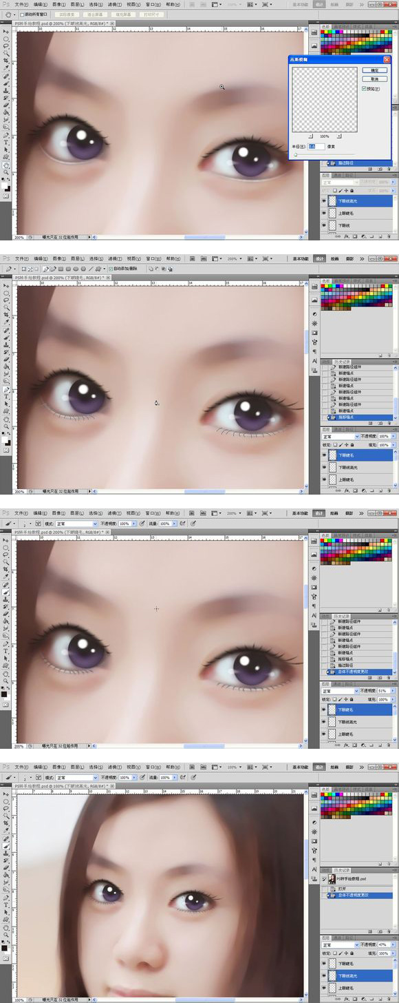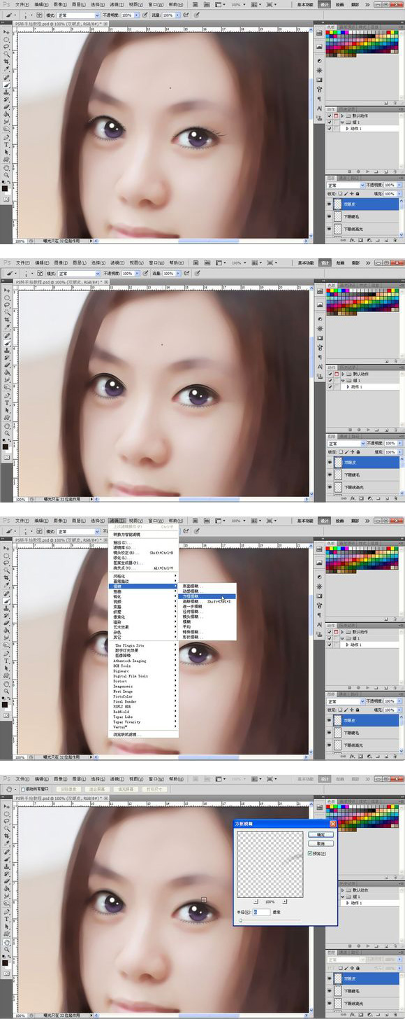 20、再描边一次,高斯模糊,降低透明度,继续描边一次,这次颜色选中纯白,高斯模糊一下,制作眼皮高光,如图所示。双眼皮的效果就出来了,接着用纯白色画笔在眼角那里点两个点,用涂抹工具涂抹一下。