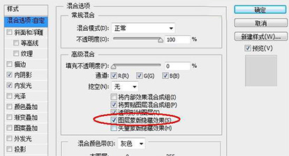 双击图层,打开图层样式面板。在混合选项中,将“图层蒙版隐藏效果”勾选上。