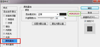 按住Alt键双击背景图层,使其转换为普通图层。然后再次双击,打开图层样式面板,为其添加颜色叠加样式,颜色为#262523。