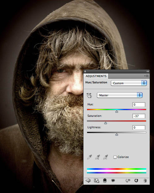 2、现在让我们添加一个色相/饱和度调整层,减少饱和度。如果你喜欢,你也可以在此步骤使用色相滑块调整色调。