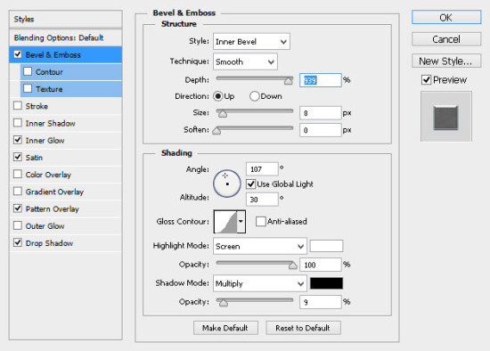 7、打开文字图层的混合模式,调整如下:斜面和浮雕: