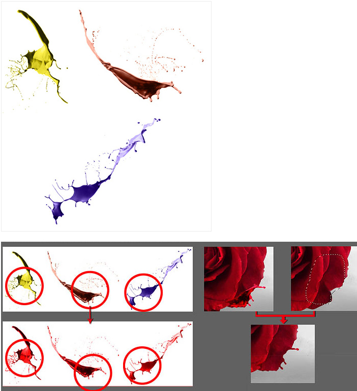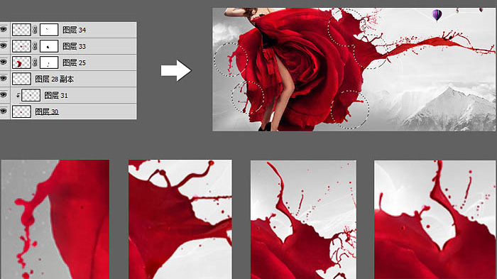 复制一部分花瓣,放置液体的上方,对其进行剪贴蒙版命名,适当的对流体进行蒙版修饰。