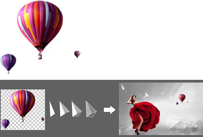 6、打开热气球素材,将其拖到调整图层的上方,然后画出立体三角的修饰图层。